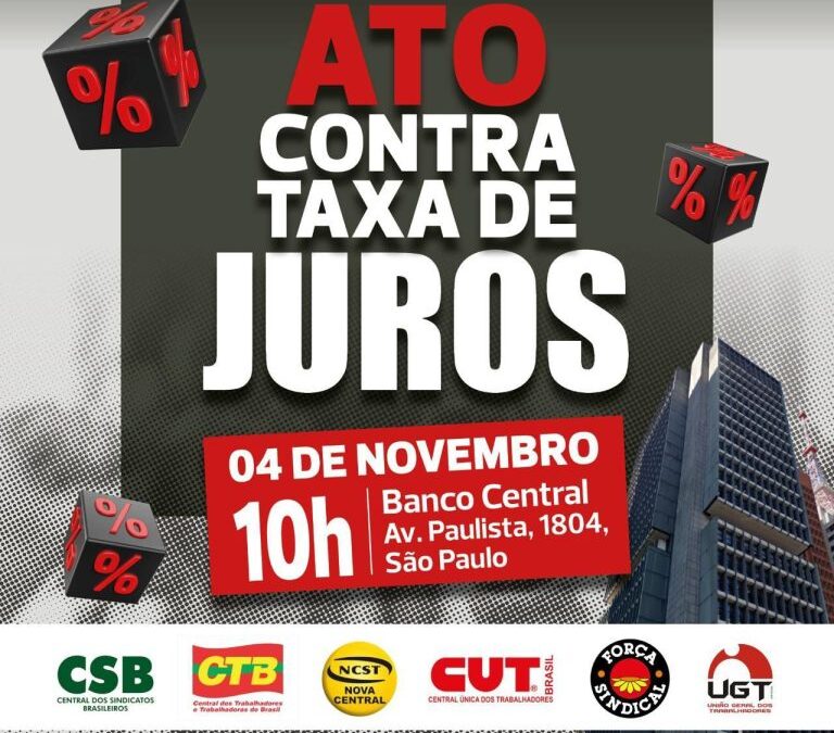 As centrais sindicais convocam ato nacional contra os juros altos, marcada para 4 de novembro, às 10 horas, em frente ao Banco Central, na Avenida Paulista.