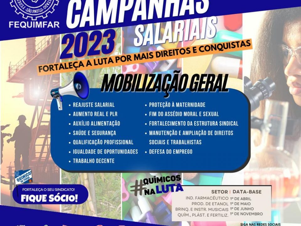 Fequimfar organiza as campanhas salariais do primeiro semestre de 2023. Reposição das perdas salariais, aumento real, piso salarial, PLR, cartão alimentação, entre outros, farão parte das principais reivindicações!